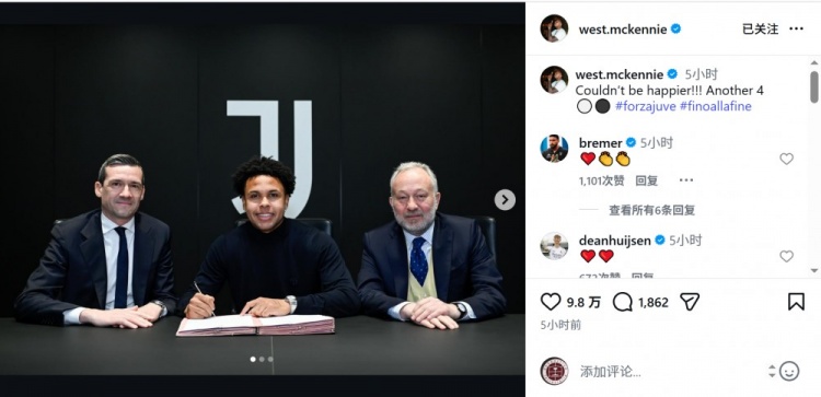 尤文官方宣布,麦肯尼与俱乐部续约至2030年。麦肯尼社媒晒出签署新合同的照片,配文:“再开心不过啦!又签了4年。”